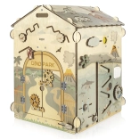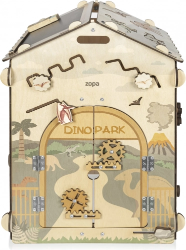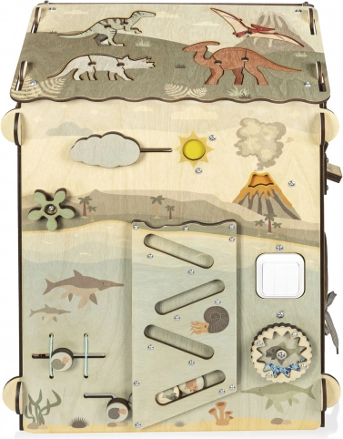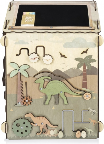 Fedezd fel az őskor szórakoztató és tanulságos világát – a nagy, fából készült Dino Park témájú aktivitásház fejleszti a finommotorikát, a logikus gondolkodást és a kreativitást. A gyerekeket világító vulkán, mechanikus kapcsoló, 3D dinoszaurusz kirakó, forgatható képek, labirintusok, cipzárak és fűzögetés várja. Része egy krétás rajztábla és a minőségi fából készült, biztonságos kivitelezés.