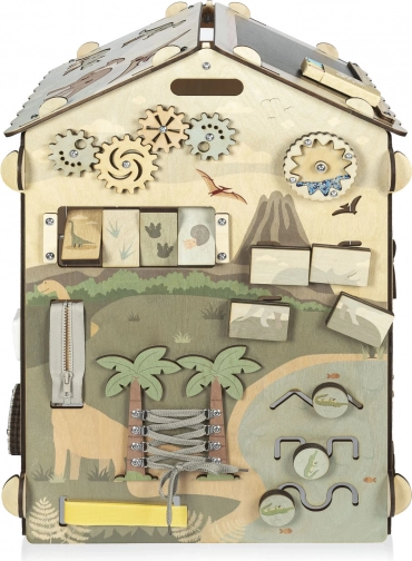 A tető fekete, krétás táblaként használható, a 3D dinoszaurusz kirakók fejlesztik a térbeli gondolkodást, a lábnyomos, forgatható lapocskák pedig a figyelmet és a logikát. A gyakorlati elemek, mint a cipzárak, fűzők, fogaskerekek és labirintusok, az önállóságot segítik.