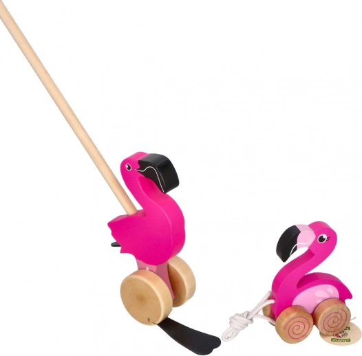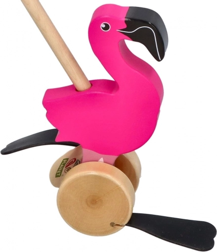 A rúdon tolható fa flamingó ideális társ az első lépésekhez. A simán gördülő kerekeknek és a stabil szerkezetnek köszönhetően könnyen tolható, miközben a mozgó elemek szórakoztató hatást keltenek, ami motiválja a gyerekeket a sétára és felfedezésre.