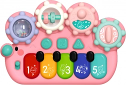 Ez a játékos zongora rózsaszín színben forgatható fogaskerekeket kínál, amelyek fejlesztik a gyermek finom motorikáját. A színes billentyűk számokkal dallamokat játszanak, amely bevezeti a gyermeket a zene és ritmus világába. Finom pasztell rózsaszín színe gazdagít minden gyerekszobát.