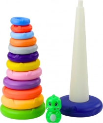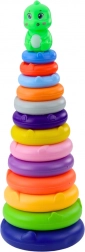 Ez a játék egy szilárd és stabil alapból, magas csapból és 13 különböző méretű színes karikából áll. Minden elem könnyű és tartós műanyagból készült, ami biztonságos a kisgyermekek számára. A torony legfelső részét egy bájos dinoszaurusz figura díszíti, amely felkelti a gyermekek figyelmét és ösztönzi további játékra.