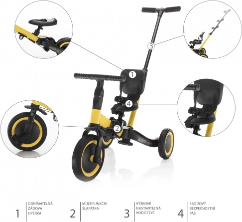 A moduláris kialakításnak köszönhetően zökkenőmentesen válthat a tricikliről futóbiciklire, majd kerékpárra. A masszív kivitel, a stabil kerekek és a kényelmes nyereg biztonságot és komfortot nyújt a mindennapos használat során.