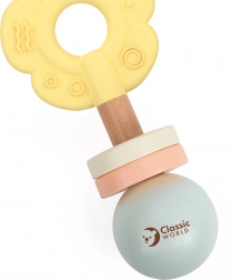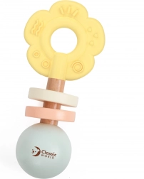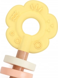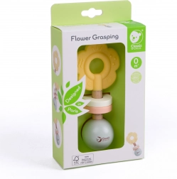 Aranyos virág formájú csörgő, amelyet a legkisebbek számára terveztek, lágy pasztellszínekkel, amelyek vonzzák a gyermek figyelmét. Biztonságos anyagokból, fából és szilikonból készült, születéstől kezdve használható.