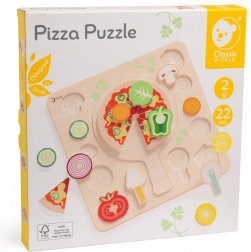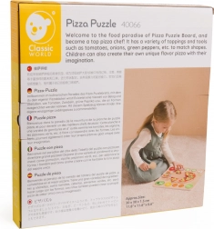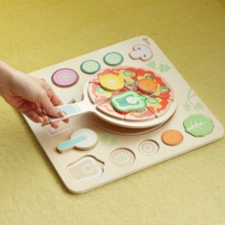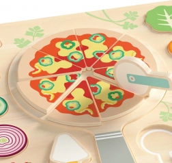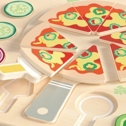 A fából készült pizza vágásra 22 darabot tartalmaz, amelyeket össze lehet állítani és testre lehet szabni, ideális a formák és színek felismerésének megtanulásához. A játék esztétikus kialakítású, kedves színekben, amelyek ösztönzik a játékra. Biztonságos, sima fából készült, amely sok órányi szórakozást nyújt.