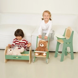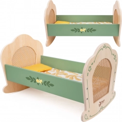 Ez a bűbájos, zöld árnyalatú bölcső a vintage stílus időtlen báját a rattan fonat természetes szépségével egyesíti. A klasszikus részletek és a tompa színek tökéletes kiegészítővé teszik bármilyen gyerekjátéknak, akár a babák, akár a plüssmackók ápolására. A finom díszítés a bölcsőnek egyedi karaktert kölcsönöz, és a puha ágyneműkészlet kényelmes alvást biztosít a babának.