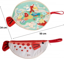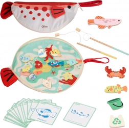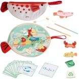 - 2 mágneses horgászbot, fa halacskák és kifogható tárgyak, oktatókártyák, hal alakú szőnyeg / tok