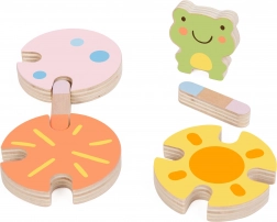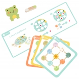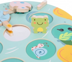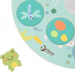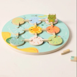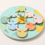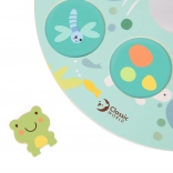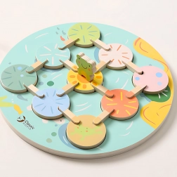 Színes fa béka és finom pasztell árnyalatok adják meg a játéknak az esztétikai értéket és segítenek a színek felismerésében.