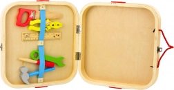 A készlet alapvető eszközöket tartalmaz, mint fűrész, kalapács, csavarhúzó, lapos kulcs, fogó és vonalzó, valamint színes szerelési elemeket – csavarok, anyák és furatokkal ellátott fa blokkok, amelyeket a gyermek könnyedén csavarozhat és összekapcsolhat.