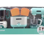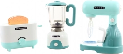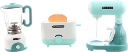 Szórakoztató konyhai kisgépkészlet kis szakácsoknak, amely tartalmaz egy turmixgépet, egy habverőt és egy kenyérpirítót elemes működéssel. A játékok fény- és hangeffekteket adnak ki, valamint mozgó alkatrészekkel rendelkeznek, amelyek hűen utánozzák a valódi készülékeket. Ideális a képzelet fejlesztéséhez és a szerepjátékhoz 3 éves kortól.