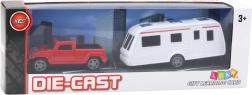 Ez a játékkocsi szett lakókocsival die-cast technológiával készült, ami azt jelenti, hogy az autó karosszériája fémből van, míg egyes elemei strapabíró műanyagból vannak. Az anyagok ilyen megválasztása biztosítja a játék tartósságát és esztétikáját. A lakókocsi könnyen leválasztható az autóról, így a gyerekek sokféle játékszcenáriót hozhatnak létre – nyaralásoktól családi kirándulásokig.