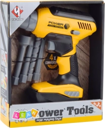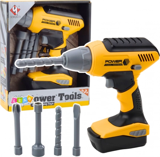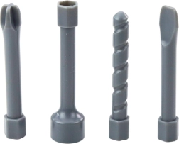 A készlet részei 4 cserélhető fej: fúrószár, lapos csavarhúzó, kereszt csavarhúzó és kulcs. A gyerekek testre szabhatják az eszközt az 'javításaikhoz'.