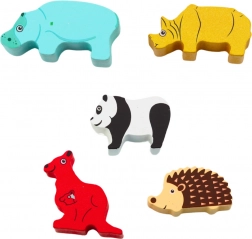 A készlet kézzel festett, fából készült figurákat tartalmaz, amelyek egzotikus és erdei állatokat, például elefántot, pandát, kengurut vagy sündisznót ábrázolnak. Minden elem természetes fából készült és nem mérgező festékekkel van bevonva, így biztosítva a biztonságos játékot a legkisebbek számára is. A simára csiszolt élek kiküszöbölik a szálkák és károsodások kockázatát.