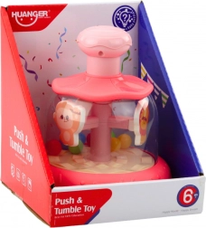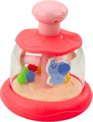 A rózsaszín gombra nyomva a körhinta forogni kezd, és az állatok a tengelyük körül kezdenek forogni, így dinamikus és színes körhintát alkotva. Ez a játék igénybe veszi a gyerekek látását, hallását és mozgását, fejlesztve a szem-kéz koordinációt és az ok-okozati megértést.
