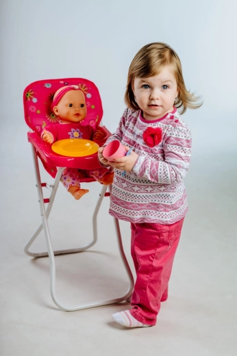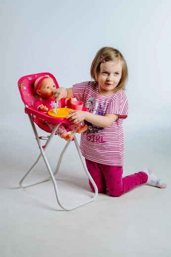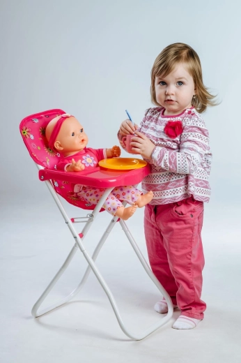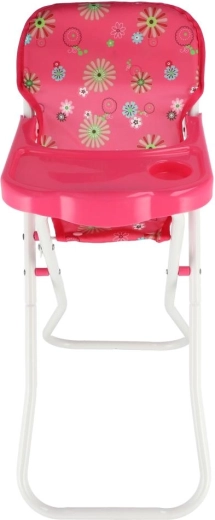 Ez az etetőszék babáknak minden kis gondoskodót örömmel tölt el. Kényelmes ülőfelületet kínál virágmintás huzattal, praktikus műanyag tálcát etetéshez és könnyű, mégis stabil fém szerkezetet. Helytakarékos kivitelének köszönhetően könnyen hordozható és tárolható.
