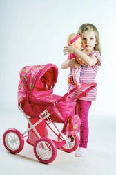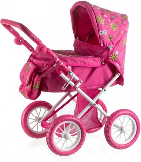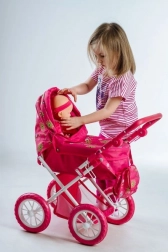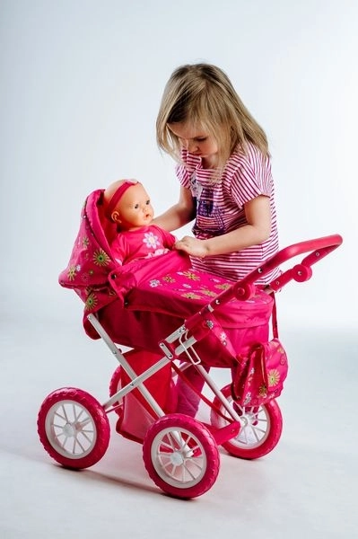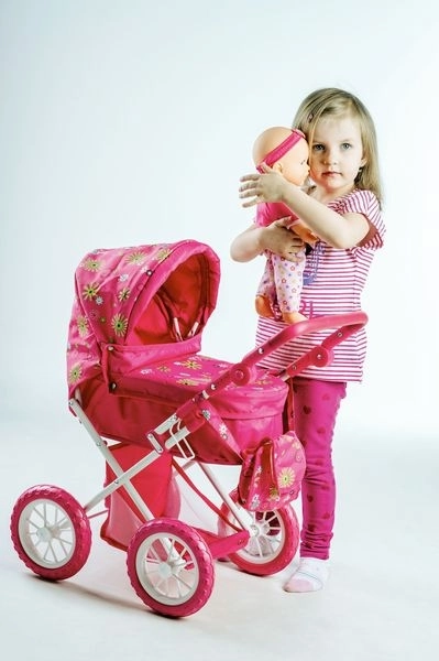 Ez a szép babakocsi játékbabáknak örömet szerez minden kis anyukának. Az alsó tárolóhellyel minden szükséges kéznél lehet. A stílusos táska a babakocsi oldalán ideális játékok és egyéb szükségletek számára.