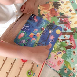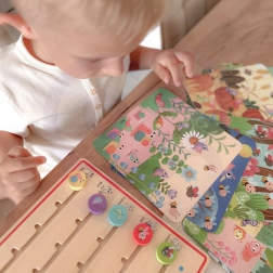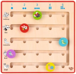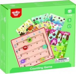 A játék 3 éves kortól ajánlott, és tartalmaz egy fa táblát a számok jelölésére és 20 erdei motívumos kártyát az állatok számolásához, ahol a hátoldalon találhatók a válaszok. A gyerekek önállóan is játszhatnak, gyakorolhatják a számolást és a szókincset magyarul és angolul is.