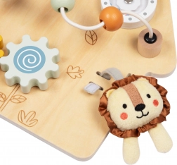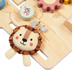 - fogaskerekek, csúszó kockák állatkákkal, csúszó tárcsák rovarokkal, tükör, szivárványív gyöngyökkel, forgó henger golyókkal, nyitható ablak, plüss oroszlánfej