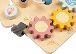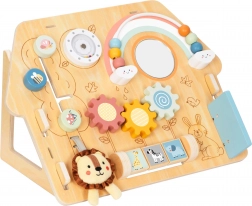 - Változatos aktivitások: fogaskerekek, csúszó kockák állatkákkal, forgó henger golyókkal, nyitható ablak, csúszó tárcsák rovaros képekkel, gyöngyös szivárvány és tükör.