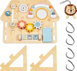 A házikó alakú fa foglalkoztató tábla 1 éves kortól órákig tartó felfedezést és játékot kínál. Támogatja a finommotorikát, az érzékelő fejlődést és a kéz–szem koordinációt a változatos tevékenységek révén: fogaskerekek, csúszkák, tükör, gyöngyök a szivárványíven és forgó hengerek. Minőségi fából készült, és úgy tervezték, hogy a legkisebbek számára is biztonságos legyen.