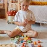 A nagy, simára csiszolt fa elemek jól kézbe illenek, támogatják a mozdulatok pontosságát, és edzik a kéz–szem koordinációt fűzés és építés közben.