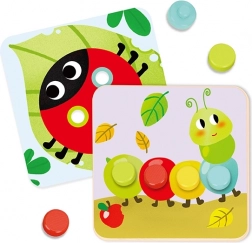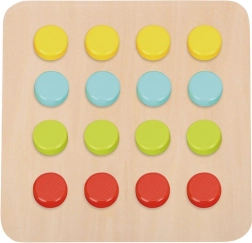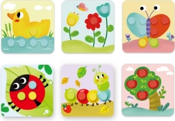 A kirakó 16 színes kockát és 6 állatos táblát tartalmaz. A kockákat a formájuk alapján kell elhelyezni, hogy a kép teljes legyen. A gyerekek látáskoordinációját fejleszti.