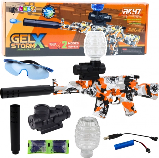 Ez a karabély cserélhető tárakkal van ellátva a zselély golyók számára, valamint egy optikai irányzékkal, ami izgalmas szabadtéri vagy otthoni játékot garantál (megfelelő térbiztonsággal). A 3.7V Li akkumulátorral táplált játék kényelmes használatot biztosít, anélkül, hogy a tartós elemcserére lenne szükség.
