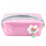Ez a kozmetikai vagy írószeres tok elegáns rózsaszín árnyalatban készült, finom csillámokkal díszítve. Az elején egy bájos, pufi felhő alakú applikáció található masnival, amelyhez két dekoratív gömb kapcsolódik, egyedi bájt kölcsönözve az egész megjelenésnek.