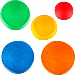 A készlet öt különböző színű követ tartalmaz: piros díszítésekkel, sárga formákkal, narancssárga gyümölcsmotívumokkal, kék betűkkel és zöld számokkal. Minden kő tartós poliuretánból készült, amely biztosítja a hosszú élettartamot.
