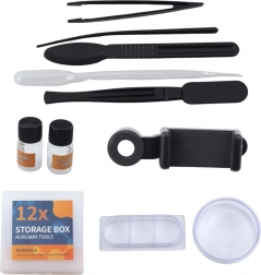 Továbbá tartalmaz egy telefontartót, amely megkönnyíti a felfedezett képek megosztását. A szükséges kiegészítők az első kísérletekhez, beleértve a csipeszt, tárgylemezeket és laboratóriumi eszközöket, szintén részei a csomagnak.