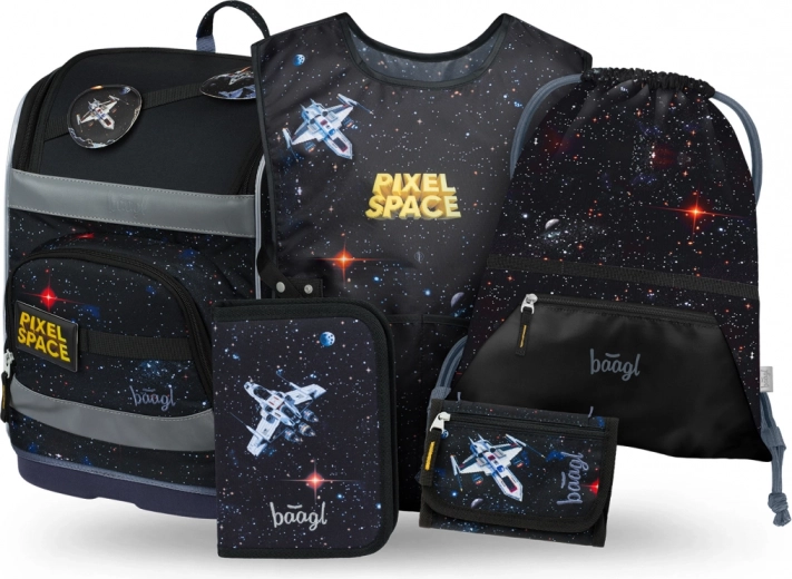 Ez a Zippy Plus Pixel Space iskolai készlet a Baagltól tartalmazza a következőket: iskolatáska, tolltartó, zsák, kötény és pénztárca. Kis iskolások számára ajánlott, a funkcionalitásra és a minőségre helyezve a hangsúlyt.