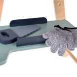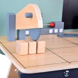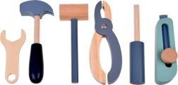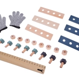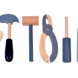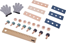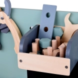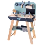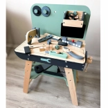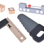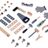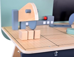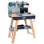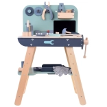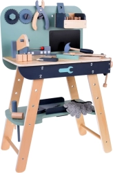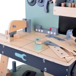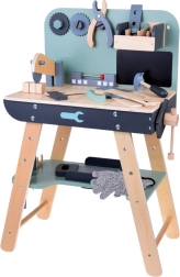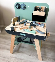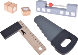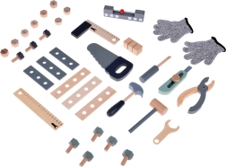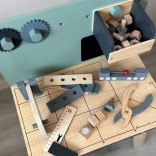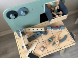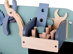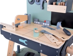 A készlet tartós fából készült, és olyan eszközöket tartalmaz, mint a kalapácsok, kulcsok, csavarhúzók és mások. Minden elem biztonságos, lekerekített és odafigyeléssel készült. A műhely rendelkezik egy kisebb krétatáblával is a tervezési projektekhez.