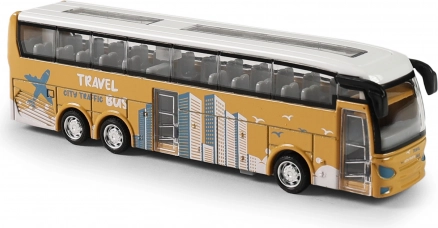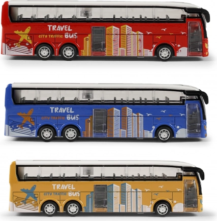Mini fém távolsági busz szabadon futó és nyitható ajtókkal, 12 cm hosszú. Ideális gyűjtőknek és modellrajongóknak.