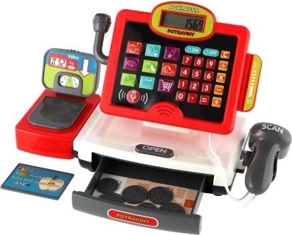 Szórakoztató és oktató jellegű gyerek elektronikus pénztárgép kiegészítőkkel a kis kereskedőknek. Tartalmaz fény- és hangeffektes leolvasót, bankjegy- és érmeutánzatokat, hitelkártya-nyílást, működő számológépet és mérleget gyümölcshöz és zöldséghez. Ideális játék a képzelet és az alapvető számolási készségek fejlesztéséhez.