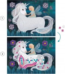 Fedezze fel a kreatív szórakozást a Djeco Mozaik Varázslatos világ készlettel. A gyerekek a számok szerint könnyedén elhelyezik a öntapadó csillogó négyzeteket és a dekoratív kövecskéket az előkészített alapokra, így gyönyörűen ragyogó képek születnek. A készlet tökéletes első ismerkedés a mozaikokkal – nem igényel ragasztót vagy ollót.