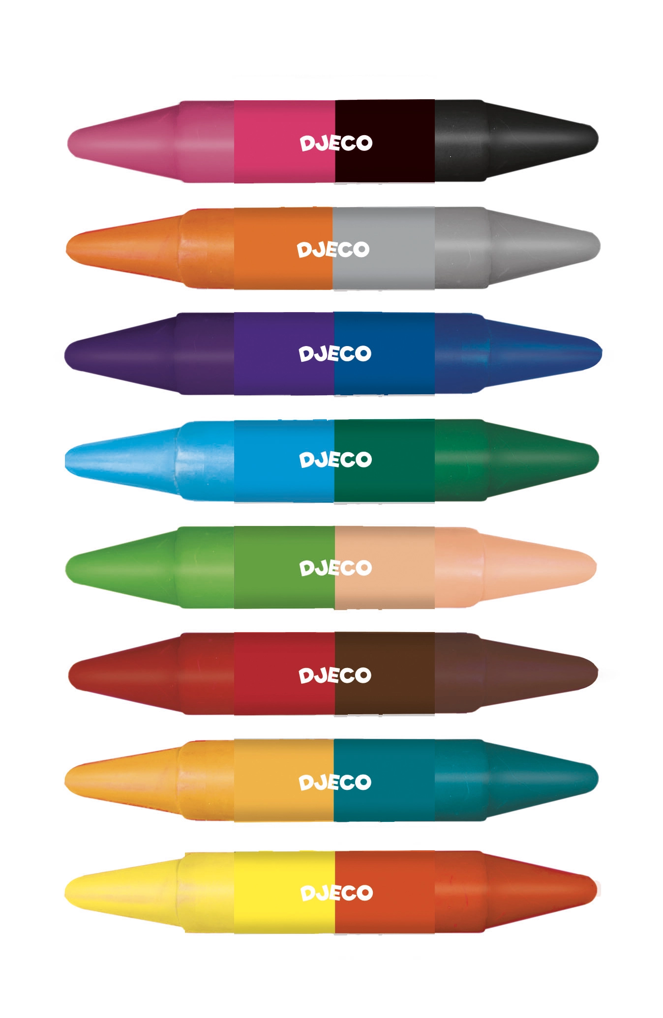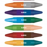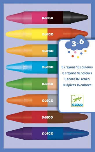 A DJECO márkájú kétoldalas viaszkréták korlátlan lehetőségeket kínálnak a gyerekeknek az alkotás során. Minden kréta két különböző heggyel rendelkezik, amelyek lehetővé teszik a színek kombinálását és a különböző rajztechnikai módszerek kipróbálását.