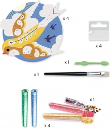 A csomag tartalma: 4 előre nyomtatott és öntapadós kártya (Ø 21 cm), 4 tubus csillám, egy csomag mini kövecske, műanyag eszköz, ecset és illusztrált, lépésről lépésre útmutató.
