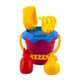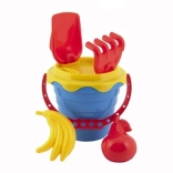 A készlet mindent tartalmaz, ami szükséges a homokban való játékhoz, beleértve a vödröt, szűrőt, lapátot, gereblyét és két homokformát.