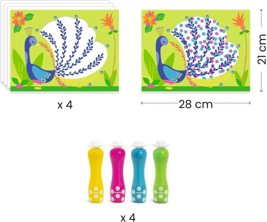 Kreatív készlet az első képzőművészeti próbálkozásokhoz pöttyözéssel a Djeco márkától. 4 darab habszivacsos filcet tartalmaz mosható tintával, ideális a 18 hónapos kortól kis kezeknek. A gyerekek játékosan tanulják a színeket és a színkeverést, a pöttyöket szabadon felvihetik az íveken kívül is – elég becsukni a „zsebet”, és az apró hibák eltűnnek. Szuper eredmények stressz nélkül és móka az egész családnak.