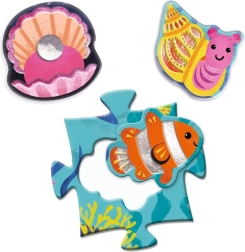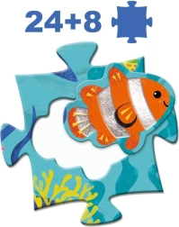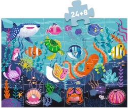 Fedezze fel a Djeco szórakoztató és tanulságos puzzle-ját kis felfedezőknek! Állítsa össze a 24 darabból álló nagy tengeri képet, majd egészítse ki a 8 formázott darab tengeri állatkával a megfelelő helyeken. Fejleszti a finommotorikát, a logikus gondolkodást és az állatok megismerését. Ideális 3 éves kortól.