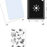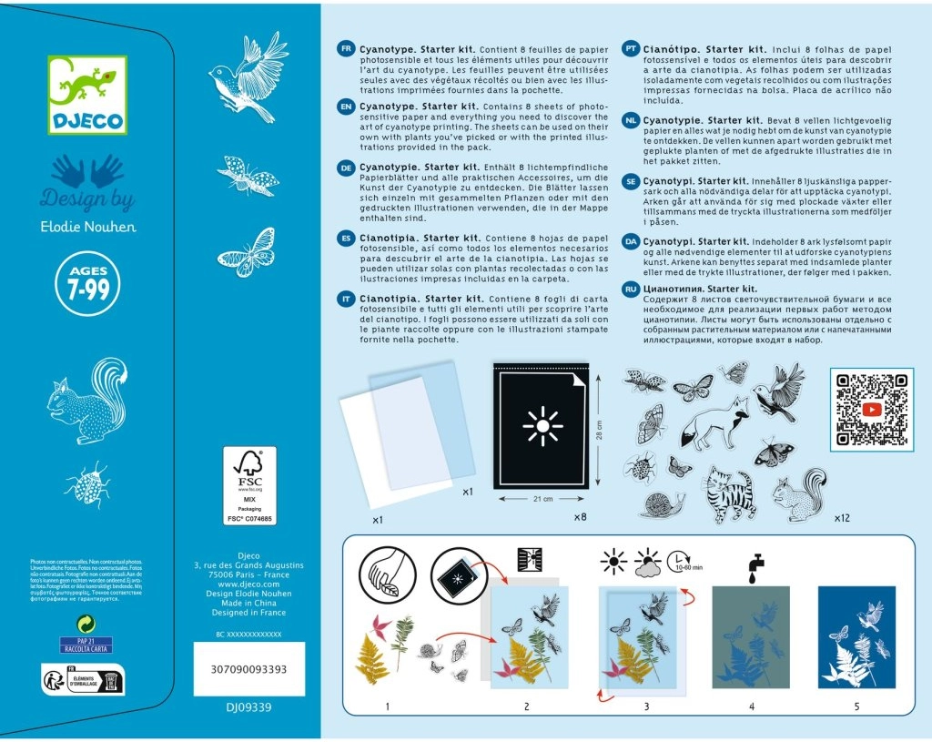 A Djeco cianotípia készlete könnyű módot kínál hatásos képek létrehozására napfény segítségével. A fényérzékeny papírra helyezd a nyomtatott mintákat, fedd le plexivel, rövid ideig világítsd meg, és öblítés után a jelenet előtűnik az ikonikus kék háttéren. Az eredmény mindig meglepő és gyönyörű.