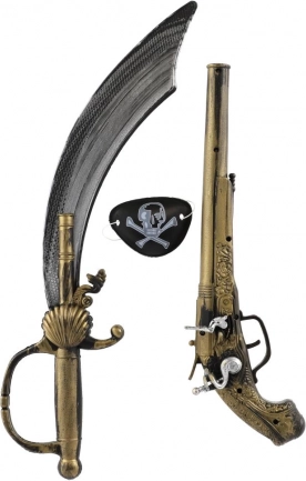 Kalóz készlet gyerekeknek karddal, fegyverrel és szemfedővel. Ideális karneválokra és ünnepekre. 3+ éves kortól. Méretek: 19x53 cm.
