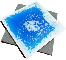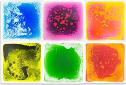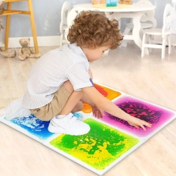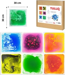 Készlet 6 darab négyzet alakú folyékony párnából, amelyek mérete 30x30 cm, és nem toxikus víz és olaj keverékkel vannak megtöltve élénk színekkel, ideális szórakoztató és biztonságos érzékszervi tevékenységekhez gyerekek számára.