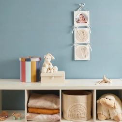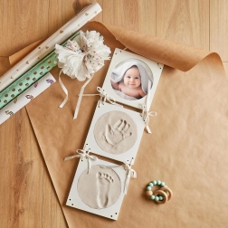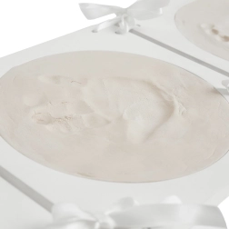 Ragadja meg a varázslatos pillanatokat ezzel a baba kéz- és lábnyomat készlettel. A készlet elegáns, kerek kereteket kínál három ablakos elrendezéssel. Tartalmaz helyet két nyomatnak és egy fotónak a babáról.
