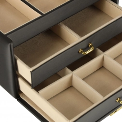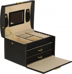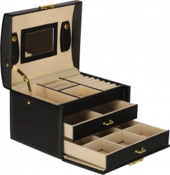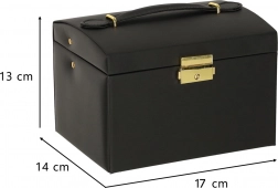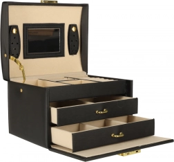 Az átgondolt tagolás gyűrűhengereket, apróságoknak való rekeszeket és 2 kihúzható fiókot tartalmaz elválasztókkal láncokhoz, karkötőkhöz és fülbevalókhoz. A kulcsos zár és a megbízható patentzár biztonságos tárolást garantál az értékek számára.