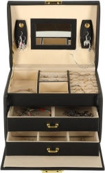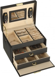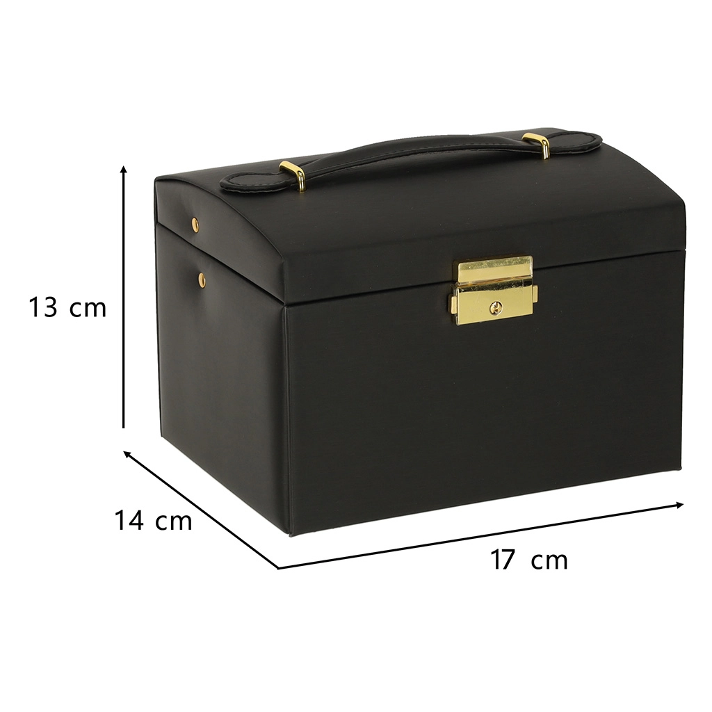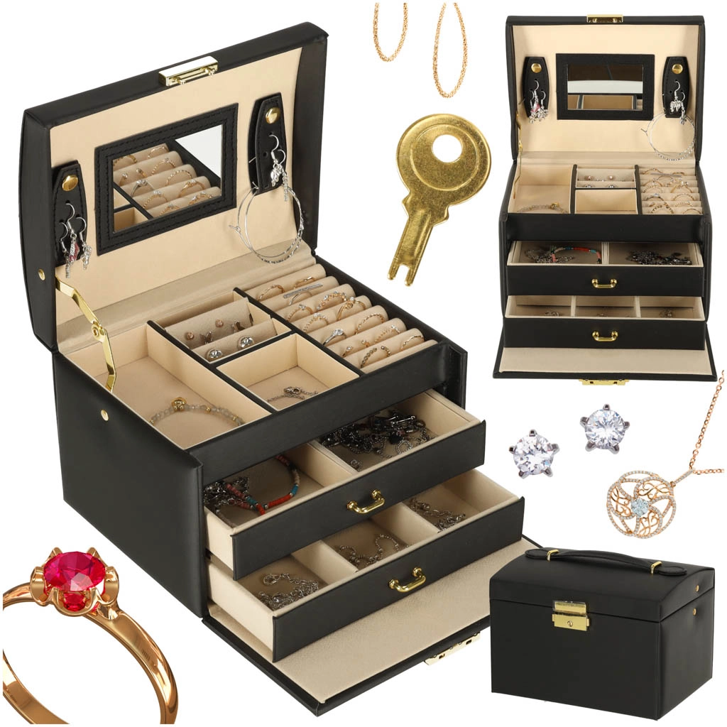 Elegáns fekete ékszerdoboz tükörrel és fiókokkal a gyűrűk, fülbevalók, karkötők és nyakláncok áttekinthető tárolásához. Kínál tágas rekeszeket, két fiókot, puha bélést a karcolások ellen és kulccsal zárható rendszert a nagyobb biztonságért. Ideális megoldás rendezett ékszertároláshoz otthon és utazáshoz.