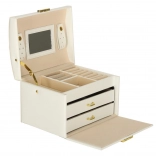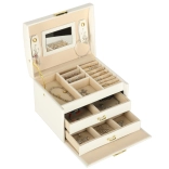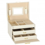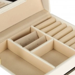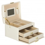 Elegáns és tágas ékszerdoboz tükörrel, amely rendezetten és biztonságban tartja a gyűrűket, fülbevalókat, karkötőket és láncokat. Puha, bársonyos belső kárpitja, két fiókja, gyűrűtartó szervezője és praktikus kulcsra zárható zárszerkezete aranyszínű fém kiegészítőkkel rendelkezik. Ideális mindennapi használatra és stílusos kiegészítőként a toalettasztalon.
