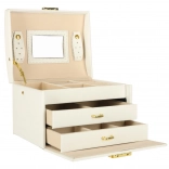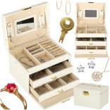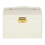 Tartós kivitel, fehér szín arany részletekkel és kulccsal zárható megoldás a biztonságos tárolásért otthon és utazás közben is. Az ékszerdoboz könnyű, helytakarékos, mégis elég tágas egy nagyobb kollekció számára.