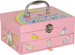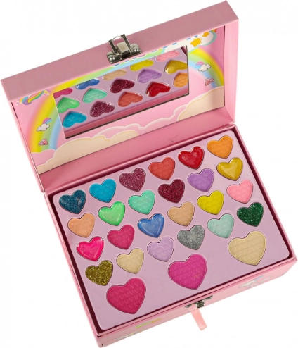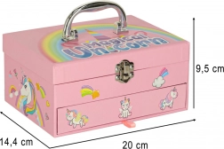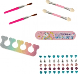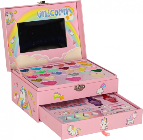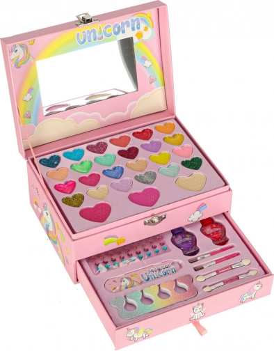 Ez a gyermek kozmetikai készlet egyszarvú mintával örömöt szerez minden kis hercegnőnek. Tartalmaz szemhéjfestékeket, körömlakkokat és további eszközöket, melyek szükségesek a gyönyörű megjelenések kialakításához.