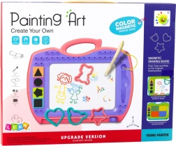 A készlet négy különböző bélyegzőt és négy sablont tartalmaz, amelyek támogatják a kreativitás fejlesztését és könnyű első lépéseket biztosítanak a rajzolásban. A színes mágneses mező felkelti a gyermek figyelmét, a kompakt méretek pedig a praktikus fogantyúval együtt lehetővé teszik a tábla könnyű hordozhatóságát bárhová - sétára, autóba vagy útra.