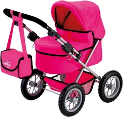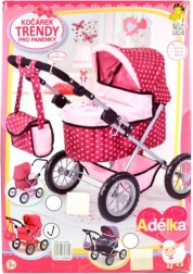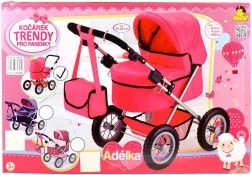 Mély babakocsi modern dizájnban rózsaszín színben, ideális maximum 42 cm-es babák számára, beleértve Adélka babát is.